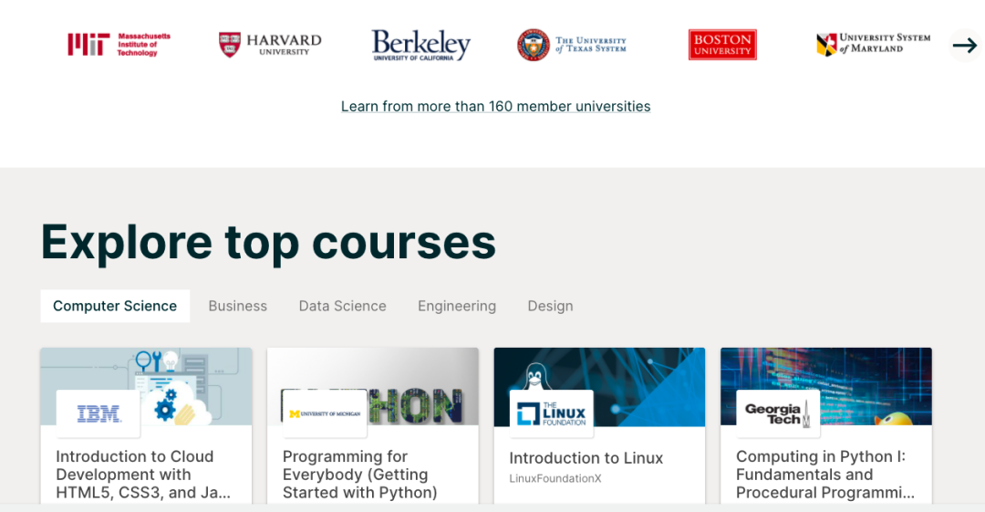 课程内容丰富,包含经济和金融、计算机科学、工程、语言、人文课程等;主要集中于化学、计算机等领域。该平台除了麻省理工和哈佛大学、还包含了伯克利、波士顿大学等名校课程。大部分课程都是免费的,不过需要付费获得证书。很适合学生去学习。