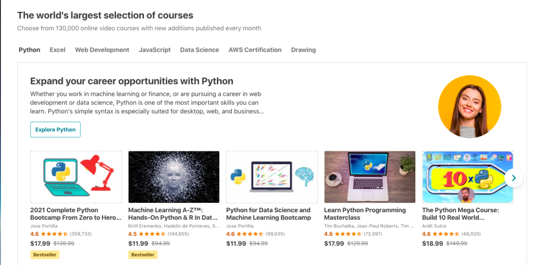 Udemy也是一个课程类别特别丰富齐全的网站,基本上什么课程都有;不仅包括一些专业知识技能的课程,还有一些生活技能的课,包括家居、摄影、绘画、化妆等。课程来源于全球各地。不过部分课程是付费的。