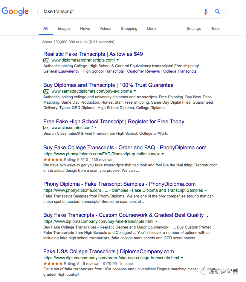 如果你一搜假成绩单,马上能找到相关产业,49美元就能开一份。看看人家这个广告写的:“Realistic Fake Transcripts ”, 真实的假成绩单。到底是真的还是假的?“Buy Diplomas and Transcripts | 100% Trust Guarantee”买毕业证和成绩单,100%信任保证。