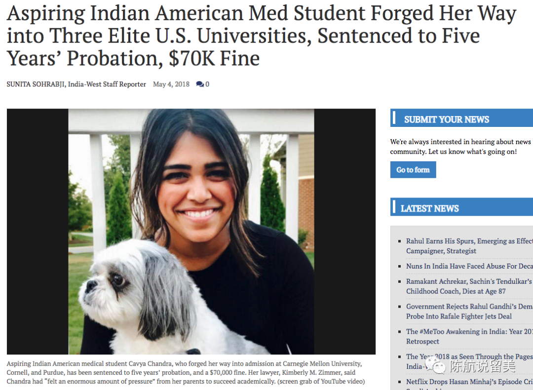 这位印度裔甜妹叫卡亚Cavya Chandra, 2017年10月被美国联邦法庭判为有罪,因为前七年时间中,她用假成绩单和推荐信进入了康奈尔和其他两所大学,并且获得过联邦学生贷款。学生因此被判一年监禁,并赔偿康奈尔7万美金。