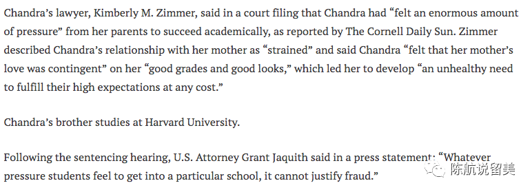 事后,这个妹子律师的发言很有意思,律师说,“卡亚从她父母方面,感到极大的压力要她学业成功。她和妈妈的关系紧张,她妈妈的爱是有条件的,条件就是她的好成绩和好长相。因为长期处于这种环境下,她衍生出一种为了完成高度期待,愿不惜一切代价的不健康心态”。顺带一提,卡亚的哥哥在哈佛学习。这段话,绕了很多弯,其实翻译得简洁一点就是:家有虎妈。而且虎妈对孩子爱的条件就是,成学霸。因此造假不能怪她,得怪来自家庭的压力。针对此等发言,美国联邦律师在新闻发布中言简意赅地回应道:不管学生进入学校遇到什么压力,这都不能成为造假理由。