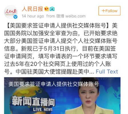 2018年3月,美国《纽约时报》报道称,政府为了加大对想进入美国的外来人员的检查,想收集申请人的社交网站信息进行审核。于是,美国国务院发布提案,要把社媒账号以及邮箱等个人信息账号加到赴美签证申请中。今年5月31日,这个政策正式开始执行。