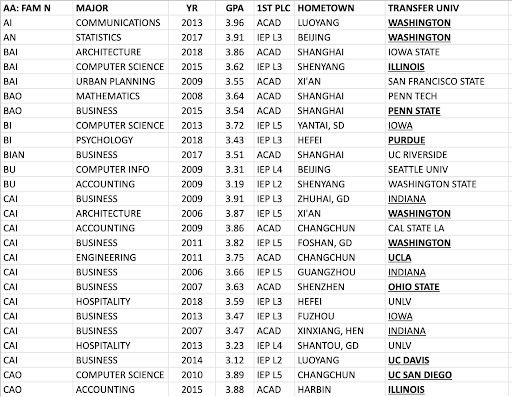 历史记录中,成绩最低的学生,GPA 2.08,转学进入了华盛顿州立大学;一个来自深圳平均分2.49的学生,转学进入了贝勒大学,这是布什家二女儿去的大学,在德州非常不错;另一个来自北京平均分2.53的学生,最后转学进入了印第安的大学;还有两个学生,分别转学到了加州艺术学院,三番艺术学院,这些应该是艺术生,他们只要作品好,GPA的成绩不是那么重要。