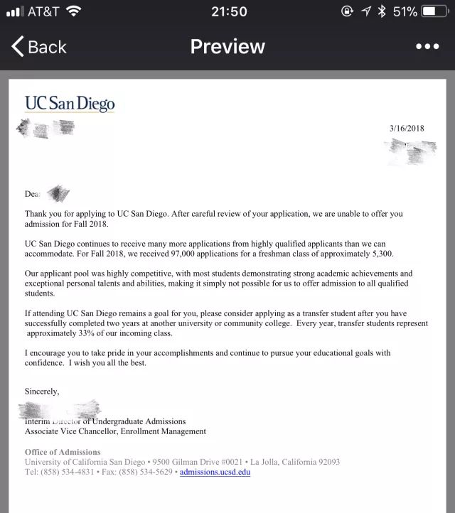 在UCSD的拒信里甚至明确的说了,每年大约有33%也就是三分之一的学生是转学生,这个比例,跟我接下来要讲的故事中的比例就重合了。