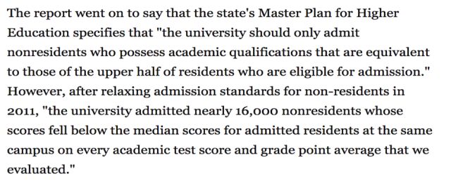调查报告发现,虽然加州Master Plan 法律有规定,加大应该只接受同本州前50%学生相当的外州学生。但是令人痛心的是,这批加大,都严重对外州学生,国际学生放水。“大学录取了16,000成绩低于本州中线成绩的外州学生。这些学生的标准考试成绩,和GPA都低于本州学生的平均数。”