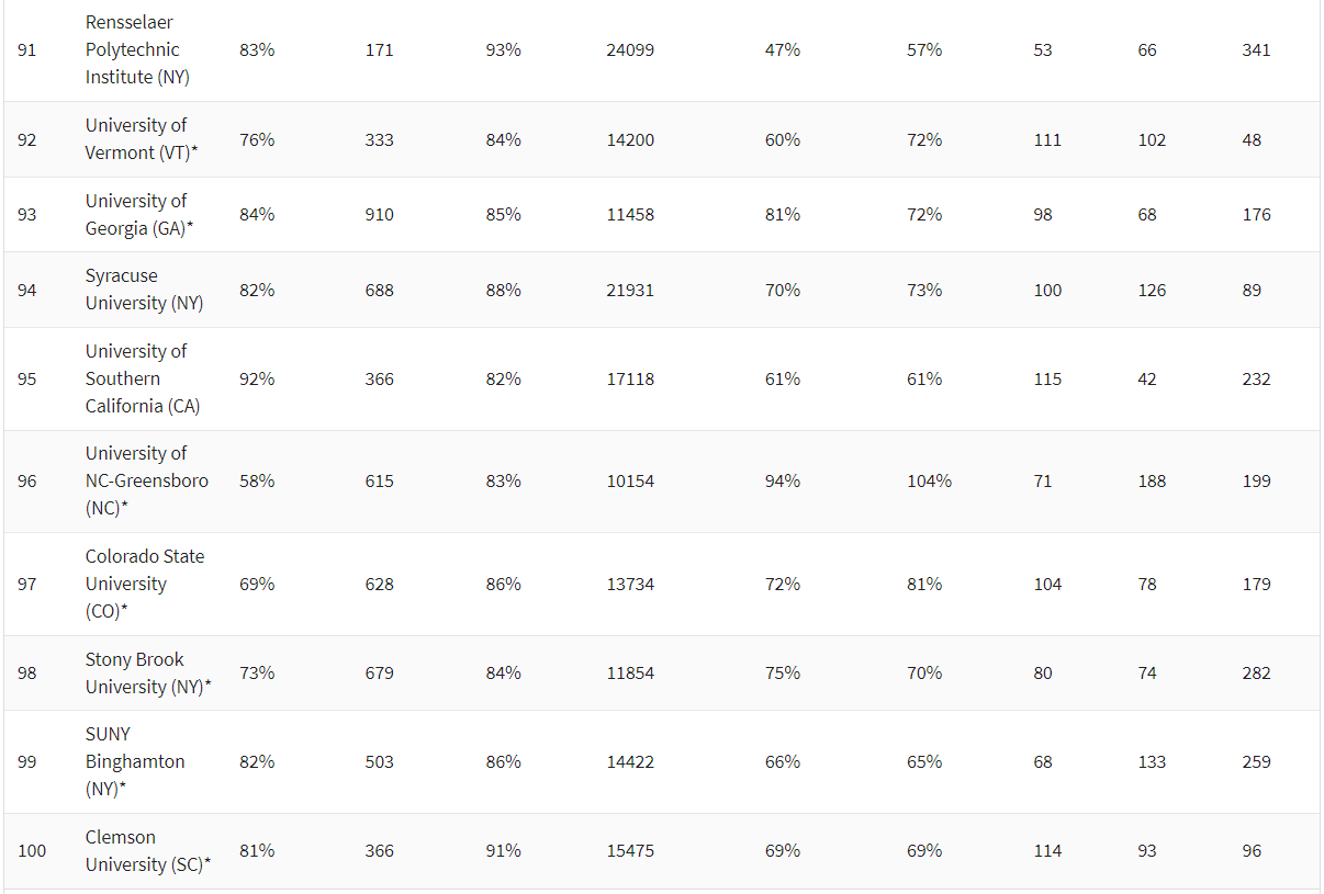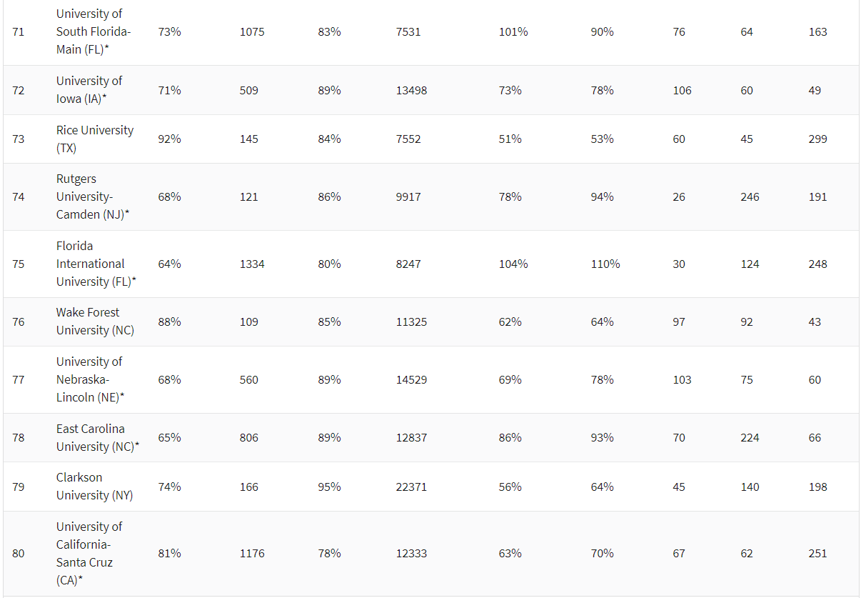 究其原因,还是由于这份排名与U.S.News相比,更加注重“性价比”。可以看到,U.S.News中的顶尖私立大学,比如西北大学、布朗大学、约翰霍普金斯大学、纽约大学,虽然综合实力强大,但是在录取率上却长期以来较低且学费较高,因此在《华盛顿月刊》中只分别排在后面。