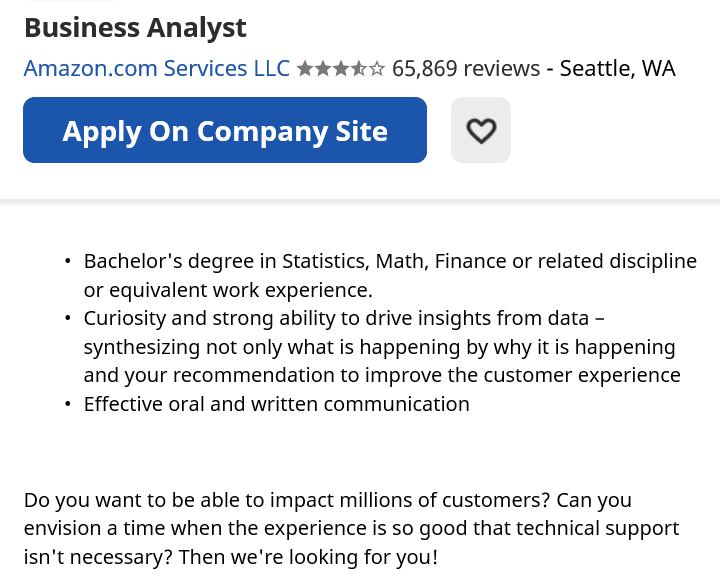 现在很多的科技巨头都有很多BA岗位opening,例如Amazon,Microsoft,Facebook, Google等。如果你没有非常强的软件编程/网页开发能力又很想进入科技公司求职,那么BA是一个非常好的选择。除了Business Analyst这个职位之外,可以供选择的职位还有data analyst,以及business intelligence engineer等。