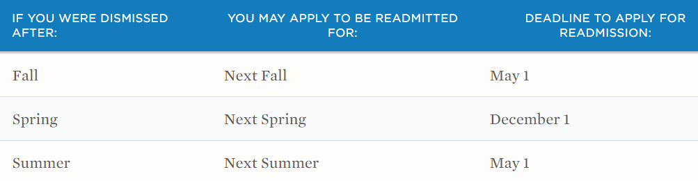 秋季学期后被开除的学生,可以在5月1日之前申请下个秋季入学;