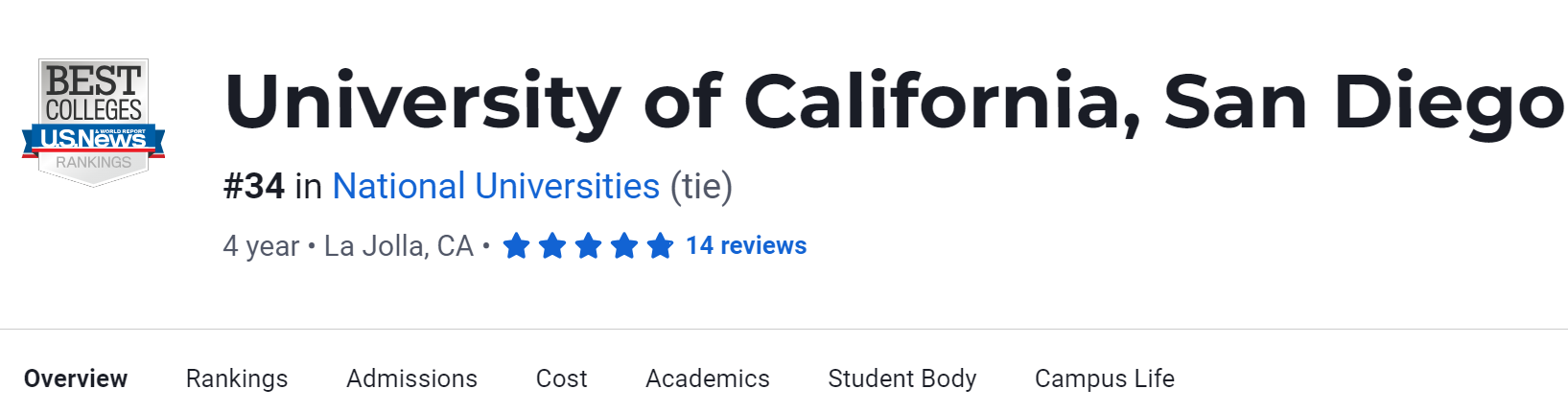 UCSD虽然建校只有短短的五十多年,但是已经成为美国顶尖的以研究科学为主,且学术声望非常高的研究性公立大学。此间学校亦被誉为“公立常春藤”之一,同时也是美国重要的学术联盟美国大学协会的成员。在2024年USNews美国大学排名中,UCSD位于第34名。