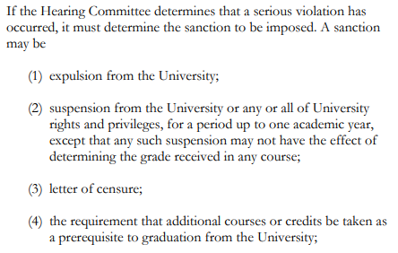 针对学生的学术不诚信行为,任课老师或导师将对学生进行初步的调查。如果认定学生的不诚信行为属实,教师将会根据事件的违规程度对学生的行为作出如下处罚:降低课业成绩,责令学生withdraw课程,重修部分或全部课程,以及完全额外的课程。如果学生的学术不诚信行为是特别严重的违纪行为,学校则会给予更加严厉的处罚(Disciplinary Sanctions)。此类处罚包括但不限于挂科、留校察看、停学、开除、甚至取消已经授予的学位等。