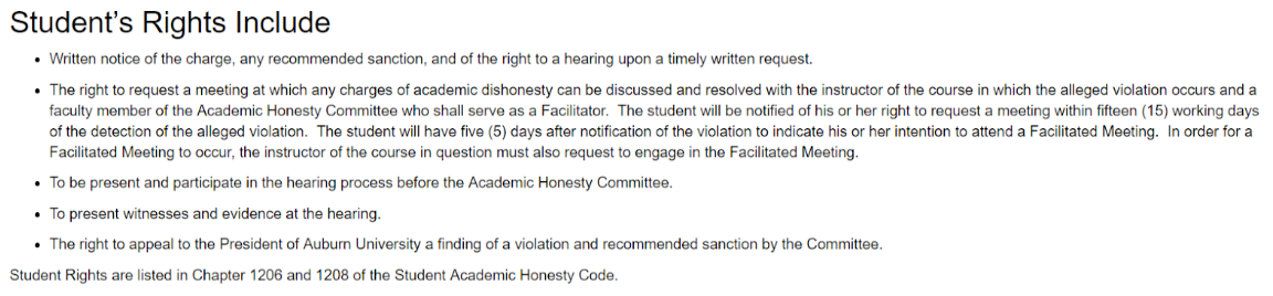 学生如果收到学术不诚信的通知,可以要求听证会为自己进行辩解。在学生被指控涉嫌违规行为的15个工作日内,学生将被告知其有权要求召开会议。学生将在通知违规行为后5天表明学生是否会出席听证会。在听证会后,学生如果对判决结果有异议,可在5天内向 the President of Auburn University进行申诉的权利。