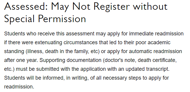 而如果GPA首次低于1.50,或者处于Conditional的状态且低于2.00,再或者重新入学后(Readdmision)依然低于2.00,则被视为Failed。