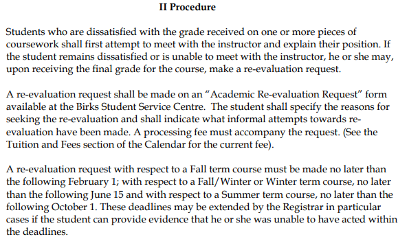在与任课老师沟通后,如果学生认定自己的成绩依然存在错误或者异议没有得到解决,学生有权利提交正式的Re-evaluation。关于成绩的Re-evaluation,学生应当提交至课程所在院系的系主任并附上申请的理由和相应的支持性材料。这里特别注意的是每个学期的Re-evaluation申请截止日期:秋季学期不晚于2月1号,冬季学期不晚于6月15号,夏季学期不晚于10月1号。在收到学生的成绩申诉后,学院通常会在30个工作日内做出答复。