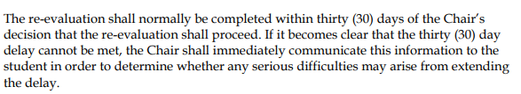 针对成绩Re-evaluation的结果,学生依然有申诉的权利。如果学生认定成绩复审结果有错误,可以在收到复审结果的15天内提交申诉请求。申诉需要提交至the Re-evaluation Appeals Panel。针对复审结果的申诉,学生必须有充足的证据可以证明成绩错误或者复审过程中存在不公平的行为,否则申诉不会被受理。在收到学生的申诉请求后,学校通常指派3名或以上的老师来负责处理申诉,并在30天内做出申诉决定。该决定为最终结果,无法继续申诉。