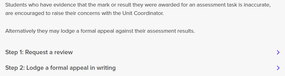 同时,对于学生的课程成绩,科廷大学也非常重视公平公正性。当学生认为自己的课程成绩存在判罚错误或者不公平时,学生有相应的课程成绩申诉的权利。在提交正式的申诉请求之前,学生应当首先与任课老师进行沟通,并要求老师重新审核成绩的准确性。如果在沟通后,学生依然认定成绩有问题,可以提交正式成绩申诉。关于成绩的申诉必须在收到成绩后的10个工作日内提出。除了提交学生规定的申诉表格外,学生还应当详细解释申诉的原因,与任课老师沟通的过程,和相应的证据。 在收到学生的成绩申诉后,学院会在10天内给出答复。
