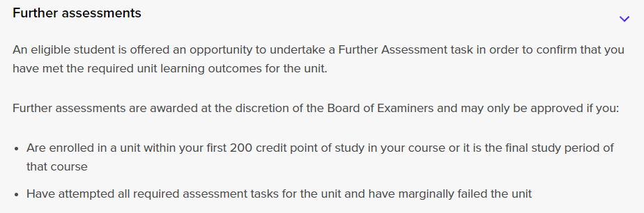 科廷大学对于课程成绩的规定非常人性化。在满足特定条件的情况时,学校会给予学生一次补考的机会。通常,只有学生的课程成绩稍稍低于及格成绩时,学生才会被给予补考的机会。如果学生在补考中达到课程的要求,可视为通过课程。