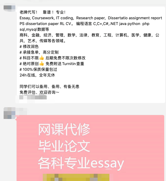 最近大部分学生都在进行网课的学习,然而我们却接到了无数学生的求助和咨询,大多都是因为代写代考被抓面临学术危机,究其原因竟然是因为看了各种代写代考小广告!看上去“靠谱”的代写代考竟然一眼就被老师发现……