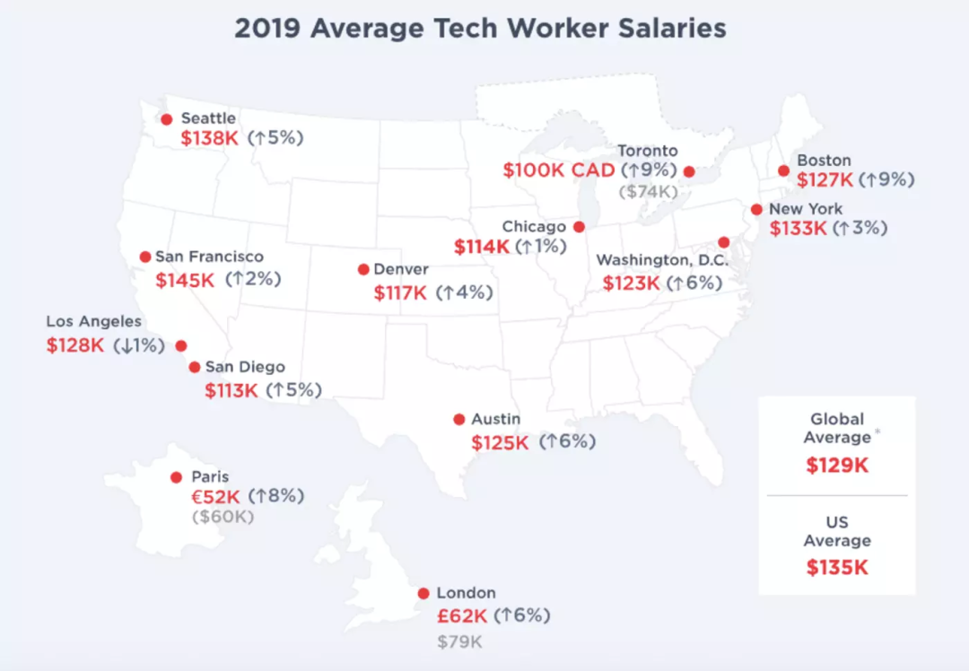 而根据Hired.com的年度薪资统计,波士顿的科技工作者的“薪资增长率”位居全美首位,高达127,000美元,而旧金山的技术工作者的年薪可高达145,000,位居全美首位。