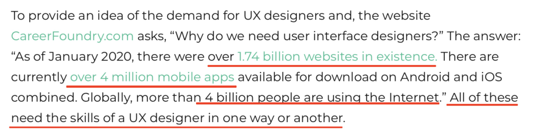跟据CareerFoundry.com的统计显示,截止到2020年1月份,全世界共有超过17.4亿个网站,在IOS和安卓平台上有超过400万个APP,全球有超过40亿人在使用互联网……所有的这些人们会产生交互的网站、软件,都需要UX设计师的维护设计和迭代更新。