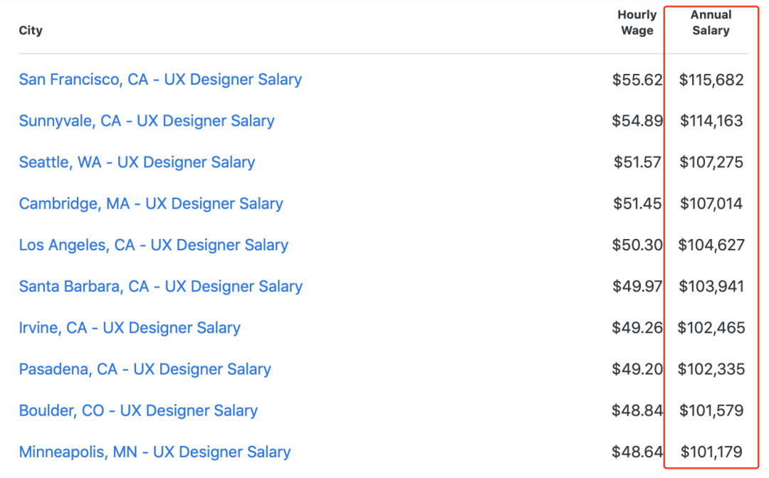 据ZipRecuiter的数据统计来看,美国大部分地区的UX designer年薪都可以达到10万美金以上。