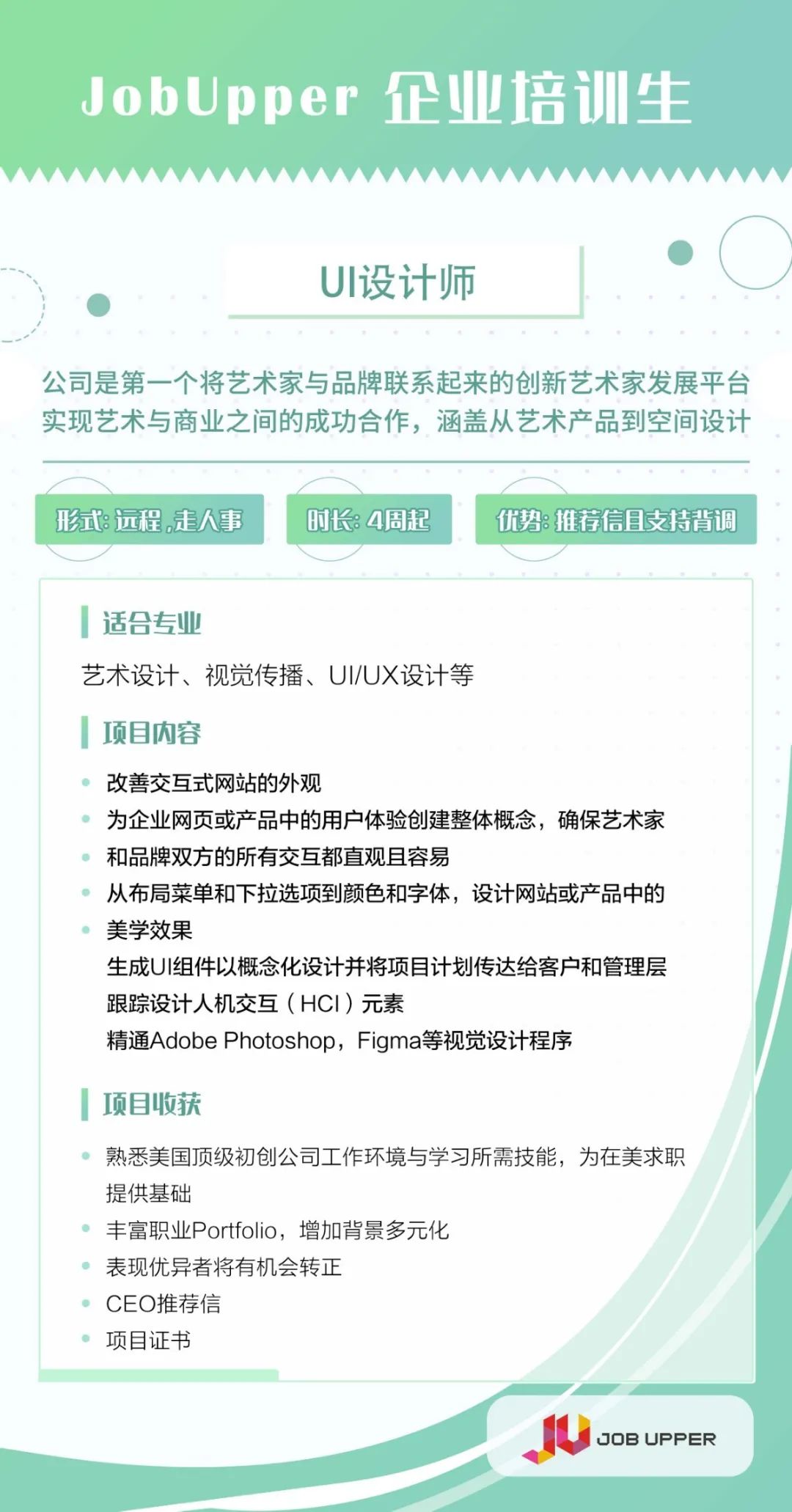 寒假马上来临,一波适合UIUX/艺术设计学生的实习机会来啦!务必抓住机会,提早积累自己的在美实习经历!