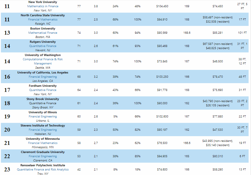而权威排名网站QuantNet也在近日发布了2021金融工程MFE项目的排名,基于全美高校不同的金工项目,录取结果,以及毕业后的就业率等做了排序,而2021的榜单不免充满了一点戏剧性: