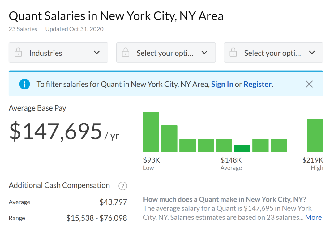 之前说了,中国留学生占据了华尔街的Quant主场,因为我们通常能够有不可替代的技术能力加成,同学们可以选择Quant作为进入金融圈的入场券。我们来看看在纽约地区Quant的工资水平,入门最低级别起薪在10万美金左右,高的超过20万,平均工资已经超过了14万,而且加上股票奖金、佣金、年终分红等,的确是一个非常理想的选择。