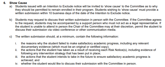针对学术成绩相关的处分,特别是停学的处罚,学生可以以书面形式向学校的学术Committee提出上诉(Show Case)。申诉必须在学校给出处分通知后的十个工作日内提交。这里需要注意的是,申诉信的准备对申诉成功至关重要,学生需要合理的解释成绩不好的原因,并详细的列出未来的学习计划等。如果学生的申诉被批准,可以立即以Conditonal的学术身份开始下一个学期的学习。