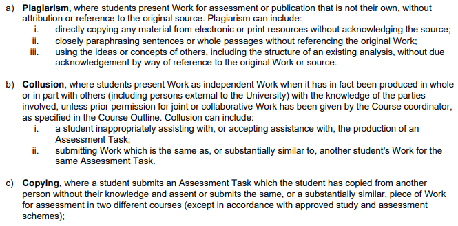 对于阿德莱德大学来说,学术诚信至关重要。学校致力于培养学生的学术诚信意识,要求学生必须在诚实方面保持最高道德标准。阿德莱德大学对于学术不诚信的定义,包括但不限于:Plagiarism、Collusion、Copying、Cheating in examinations、Contract Cheating、Misrepresentation、Solicitation等等。学校在Academic Integrity Policy对每一种行为给出了详细的解释。