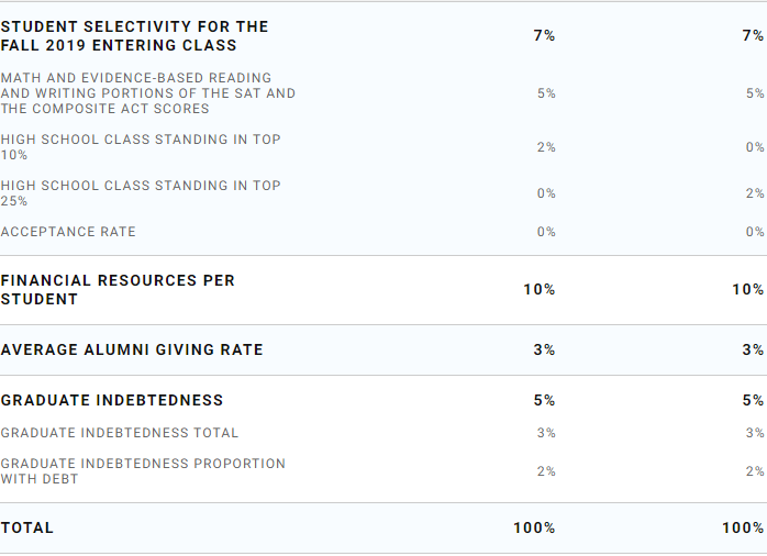 U.S.News通过收集与分析标准化考试成绩(SAT/ACT)及大学中已注册新生的高中班级排名情况,来展现这一指标。