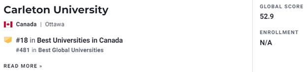 2022年USnews 加拿大大学排名中,Carleton University位于第18名。