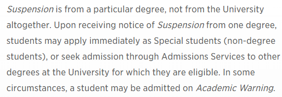 而如果学生的CGPA无法满足最低学术要求,将会面临相应的学术处罚。当学生的成绩第一次低于学校标准时,学校会给予学术警告(Academic Warning)。处于学术警告的学生,必须尽快提高自己的成绩,以避免更加严厉的处罚。如果在接下来的学期学生依然无法达到标准,将会直接被停学(Academic Suspension)。此外,如果学生CPGA低于1.00,也会被停学。停学处罚通常为至少一个学年。