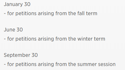 针对学术成绩相关的处罚,学生有求情(Petition)和申诉(Appeal)的权利。但是,CarletonUniversity规定,只有在特殊情况下,学生的Petition才有可能被受理。第一种情况是学生有特殊的个人原因,例如健康原因,不可预见的特殊情况等;第二种情况是存在不公平或不合理的规定导致学生成绩不达标。如果学生决定提交Petition,应当在截止日期之前向the Registrar’s Office提交书面请愿。具体的申诉截止日期如下。
