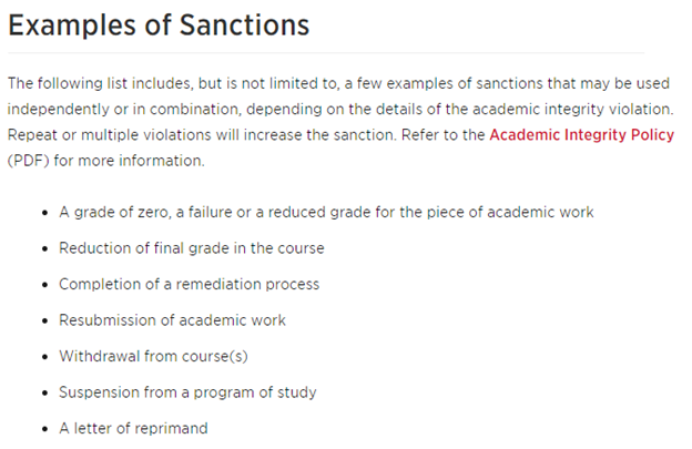 针对以上各种学术不诚信行为,学校会根据学生的过往诚信记录和事态的严重程度,给予相应的处罚。可能给予的处罚主要包括:课业零分,扣分,挂科等学术成绩类处罚,重新完成作业,或者课程withdrawal,严重的处罚则包括警告,停学,开除等。