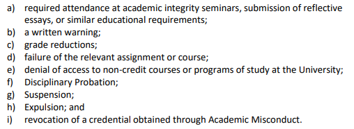 如果学生违反学术诚信准则,将会受到来自学校的处罚。根据情节严重程度和学生的过往诚信记录,学生可能收到的处分有:警告信,课业0分或挂科,停学,取消奖学金,开除,学术不诚信行为永久录入成绩单,甚至取消已经授予的学位等。