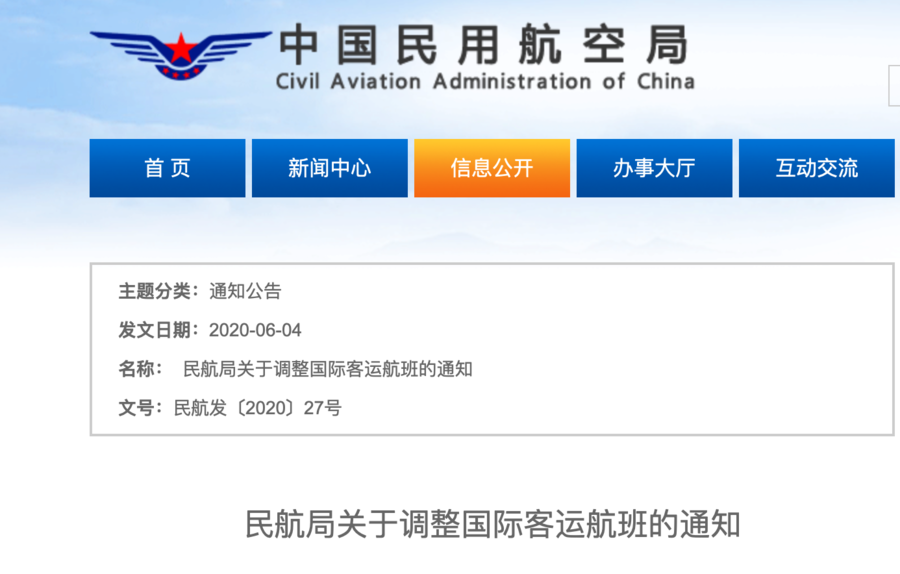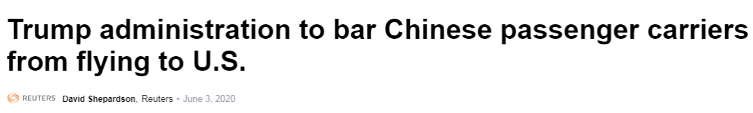 而美国交通部DOT随后便正式宣布,因中方没有允许美国航空公司提供往来中国的服务,美方将暂停允许中国航空公司提供来往于美国的航班,相关规定从当地时间6月16日开始执行,但如果总统下令,该政策随时可以提前实行。