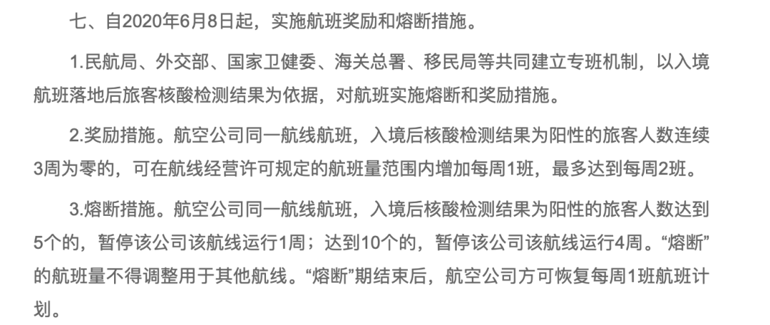 三、自2020年6月8日起,以入境航班落地后旅客核酸检测结果为依据,对航班实施航班奖励和熔断措施。