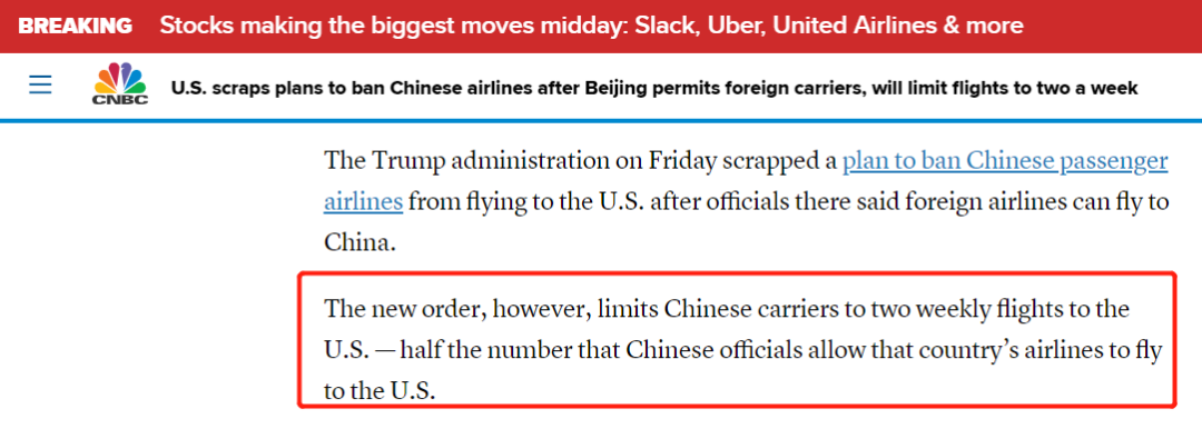 据美国交通部表示,中国因为从3月29号开始实施“五个一”政策,即一个航空公司一个国家只保留一条航线,一周最多执行一班政策,导致美国航空公司无法正常定期往返中国,“无法行使双边权利的全部内容”。