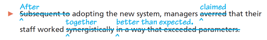 冗长或复杂的单词似乎可以使我们的写作看起来具权威性。但通常情况下,它们会使作文看起来很沉闷乏味,甚至会有一种自命不凡的调调。比如,以下就是一个将欺惑性语言改为常规语言的很好的例子(The Little Seagull Handbook)。