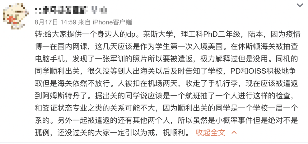 同机的同学久等不到他出关,及时向学校反映情况,PD和OISS曾积极争取但海关依旧不放行。小A被扣在机场两天,手机行李也被收走,随后被遣返回国。与小A一起被遣返的,还有另外两位同学,均是怀疑他们受中国政府资助,被认定可能危害美国国家安全。😂