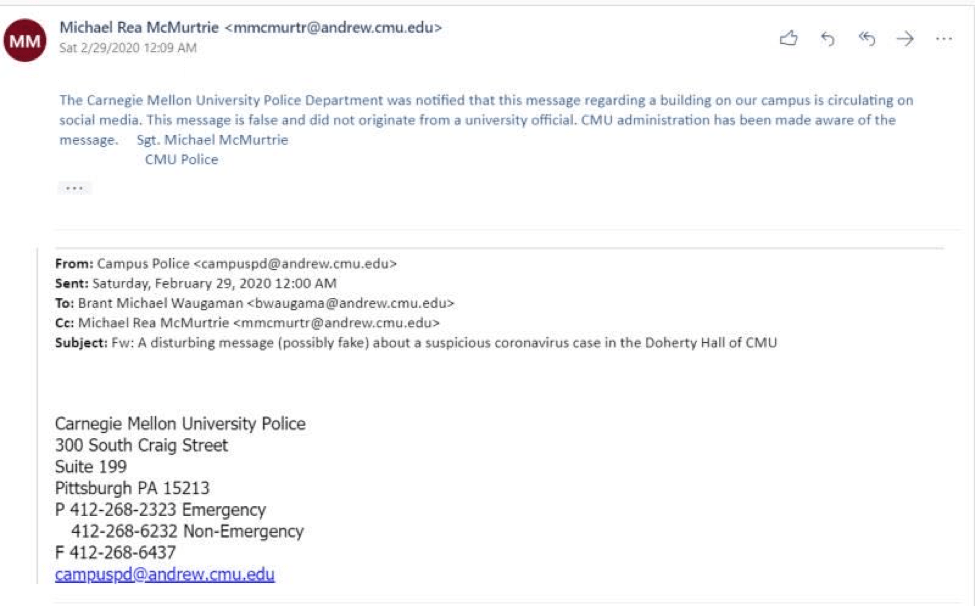 周六一早,CMU学校警察局澄清,说这个邮件是编造出来的,邮件并非任何CMU校方所发。