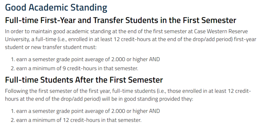 如果学生在任意一个学期结束时,未能达到上述标准,将会被留校察看(probation)。一旦学生被probation,学生需要与the Office of Student Advancement联系并讨论如何尽快的提高自己的成绩。在收到probation后,学生可以考虑进行申诉。