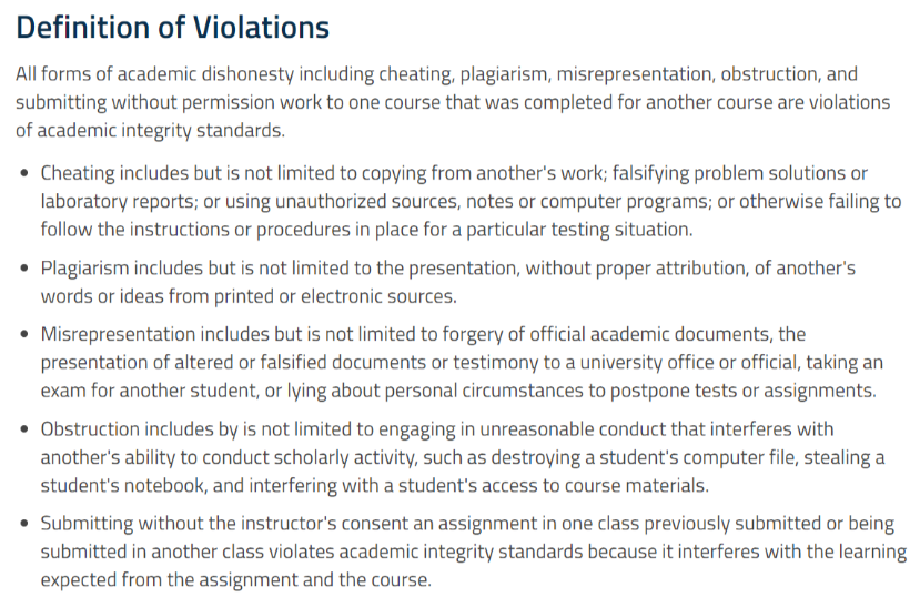 - 未经教师同意在一个班级中提交先前提交的作业或在另一个班级中提交的作业违反了学术诚信标准,因为它干扰了作业和课程的预期学习。