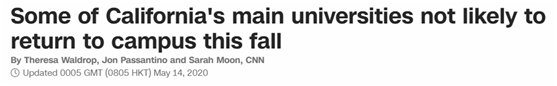 而加州州立大学系统校长Timothy White在5月12日宣布:由于COVID-19疫情,学生不会在秋季返回美国加州州立大学系统内的校园,学业还是将保持远程授课状态。