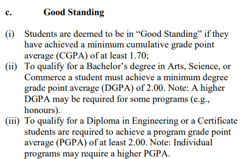 Saint Mary’s University 对本科生的学术成绩有着严格的要求,当学生的累积GPA不低于1.7时,学生处在良好的学术状态。对于想要获得艺术、科学或商科学士学位的学生的Degree GPA不低于2.00;想获得工程学文凭或证书的学生的Program GPA不得低于2.00。