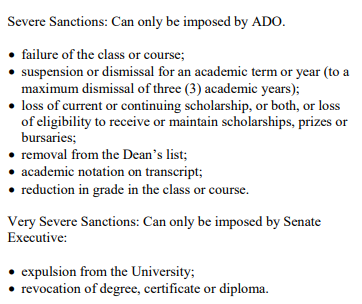 在进行相应的调查后,如果确认学生确有违反学术诚信原则,则会根据情节严重程度和学生过往诚信记录给出相应处分。学生有可能受到的处罚有:课程不及格等,留校察看,停学,开除,甚至撤销学位等。