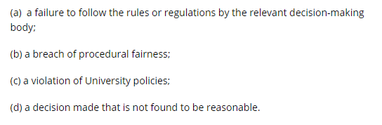 一旦学生被判定违反学术诚信行为,在收到处罚后的14天内,学生仍然有提出申诉的权利。申诉必须以书面的形式,向学校的the University Student Appeal Board提出。学生的申诉必须基于以下几点理由: