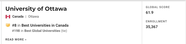 在2020USNews加拿大大学排名中,渥太华大学位于第8名。