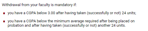 如果学生无法满足最低的学术要求,则会面临留校察看(Academic Probation)的处罚。一旦处于留校察看的状态,学生虽然可以继续留校学习,但是必须尽快提高学术成绩,以避免更加严厉的学术处罚。如果学生无法满足最低的学术要求,累积GPA在3.0或以下,则会被学校停学(Withdrawal from the faulty)停学时间通常为至少一个学期。