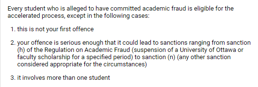 如果学生是初次违反学术诚信准则,或者学生的学术不诚信行为并不严重,再或者学生的学术不诚信行为不涉及其他学生,学生可以寻求Accelarated process对自己的行为作出判罚。此类的判罚决定通常较轻,主要为警告信或者要求完成额外学分的课程等。一旦学生寻求Accelarated process的解决方式,学生即承认自己的学术不诚信行为,同时也放弃了申诉的权利。通常此过程会在15天内结束。